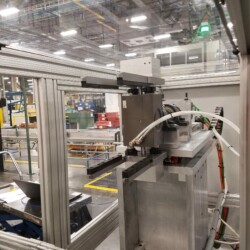 Our engine flip station cab integrate with a pre-existing engine assembly line. Once the pallet containing the part enters the engine flip station, a lift and locate mechanism picks up the motor and pallet. The grabber arm on the flip station moves into position to grab the motor. The lift and locate cylinder then lowers to allow the motor to separate from the pallet. The grabber then rotates the motor 180 degrees. The lift and locate raises again and locks the pallet onto the flip side of the motor. The grabber then releases the motor and the grabber arm moves out of the way so the pallet and motor can be lowered back to the assembly line.