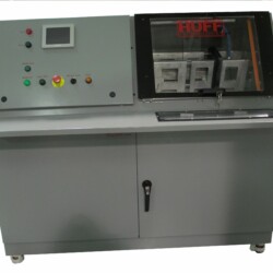 EGR Radiator Core Tester is designed to pressure test radiator cores. An operator will load a core into the machine and shut the door. The servo motor will press the edges of the core headers against gaskets on both sides of the tooling. The core will then pressurize. The pressure will then be held for 20 seconds. The servo will retract upon a passed test and the marker will eject for the operator to mark. Otherwise, the machine will fail the core and have to be reset manually.