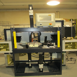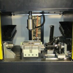 Our oil pan press works alongside an assembly line. The press is used to prepare the oil pan for admission onto the line. An oil pan is seated into the fixture for the pressing operation. Multiple servo presses and tools automatically press or bolt in the necessary tubes and plugs. Tube forces and pressing distances are logged for each oil pan.