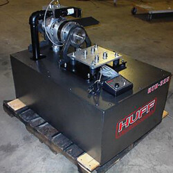 Our Huff HTH-100 Dynamometer power is transmitted to the dyno via. a 1.25" dia. shaft on the front of a 4.5" planetary gear drive. The drive is bolted directly to the front of a gear type hydraulic pump. The pump draws oil from an oil reservoir just below and forces the oil through a special valve pack directly mounted to the top of the pump. The valve pack adjusts its internal orifices to hold the motor at a set rpm by the user. The rpm remains constant even through varying throttle positions and can be made to sweep the engine up or down by changing the speed setting via a small DC motor which is provided.